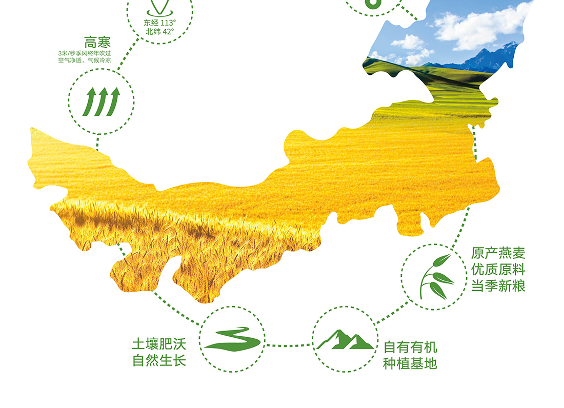 內(nèi)蒙古,世界裸燕麥起源地之一;陰山源生燕麥在此初生滿足生長規(guī)律一切所需,高寒、高海拔、日照充足;遵循自然法則,靠天滋養(yǎng),自然生長;一粒陰山源生裸燕麥,一場無聲有機(jī)革命