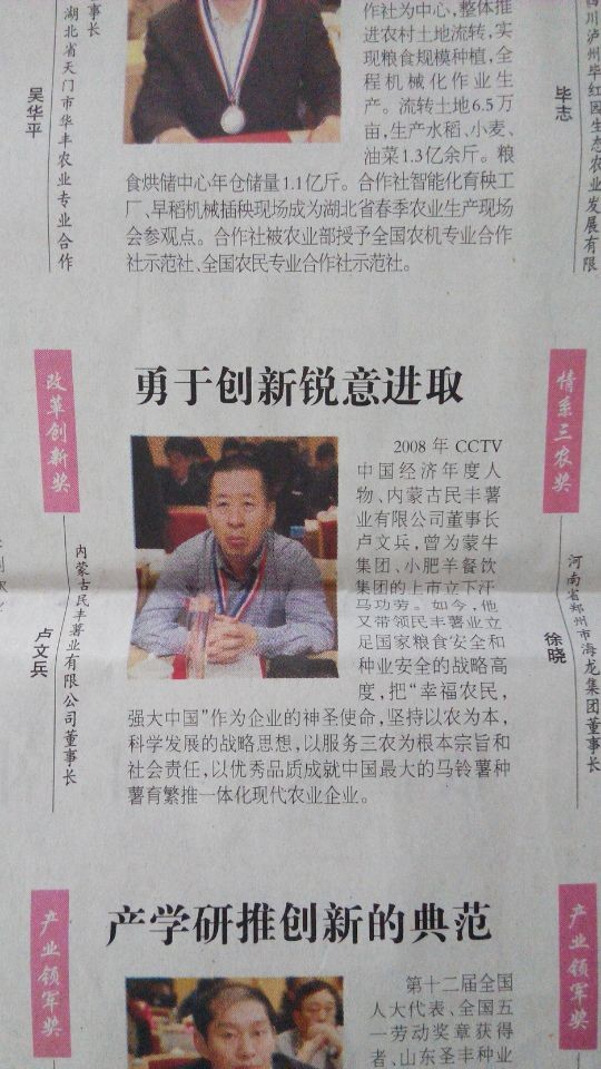 日前,全國“北大荒”杯2013年度“中國農(nóng)村新聞人物”評選活動揭曉,內(nèi)蒙古民豐薯業(yè)有限公司董事長盧文兵光榮當選,獲“改革創(chuàng)新獎”。